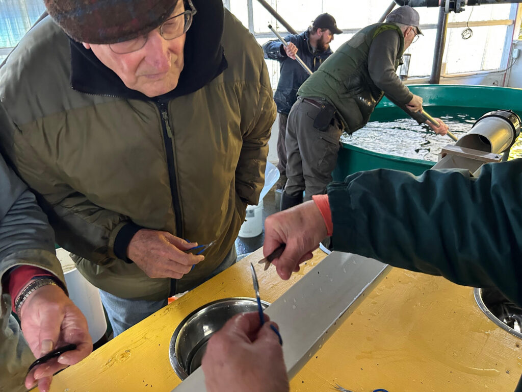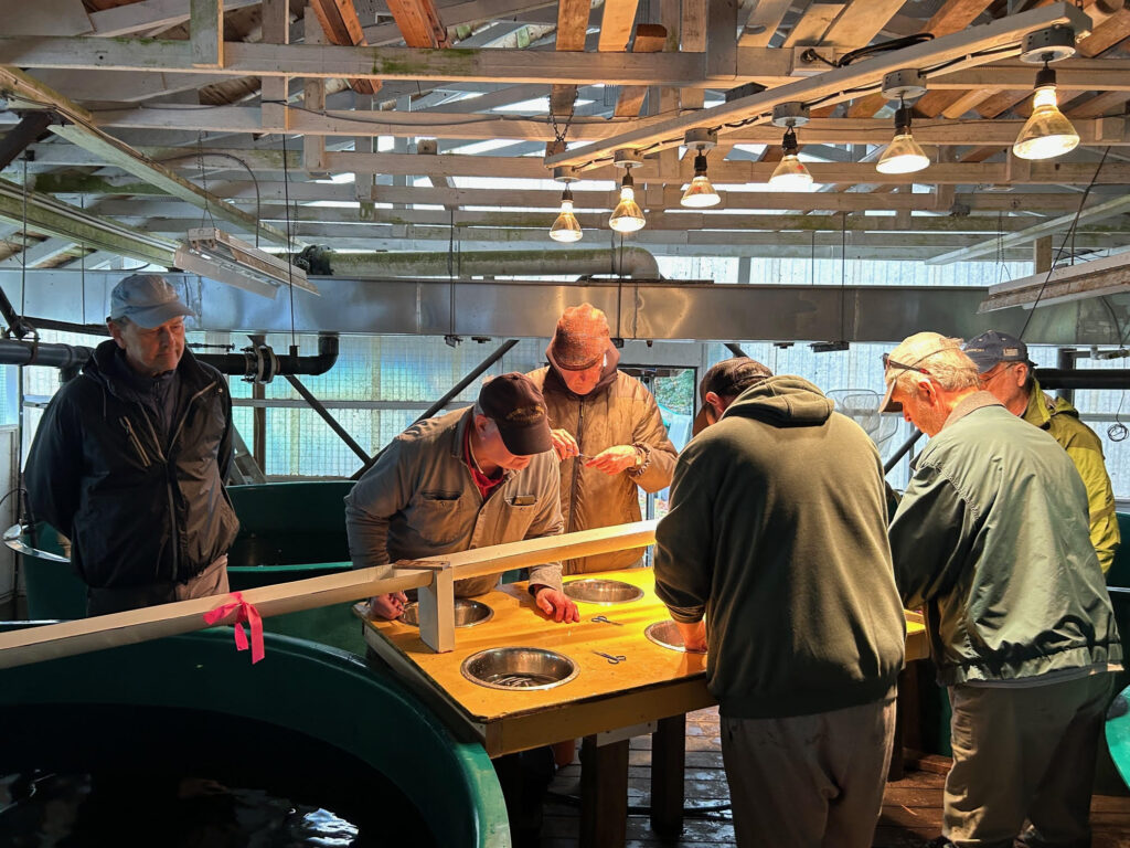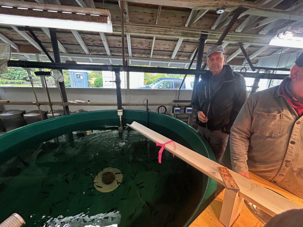On October 29th, 2025, the first of two teams of volunteers organized by our president Darren Williams in coordination with Don Lowen of the Goldstream Hatchery attended for a morning of clipping the adipose fins from a tank full of coho fry. In the three hours or so at the task, the team clipped about 2,850 fry. This team was made of Tom Celuszak, Garth and Mark Hallam, Yuri Creese, Allan Hatten and Robert Lyall.